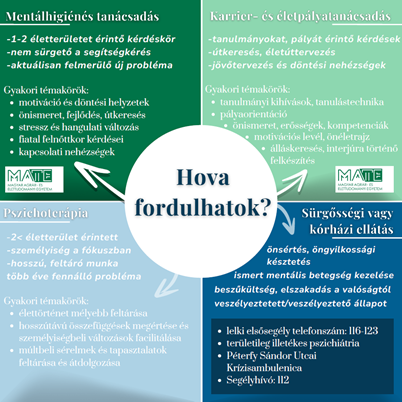 A felsőoktatási mentálhigiénés tanácsadás természete nem teszi lehetővé sürgősségi esetek kezelését. Amennyiben úgy érzed, hogy a felmerülő helyzet halaszthatatlan és azonnali segítségre van szükség, keresd fel az alábbi lehetőségek valamelyikét!